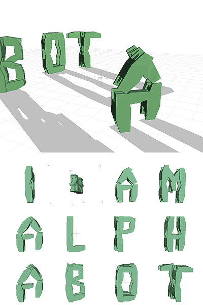 Alphabot is a robot that is capable of communicating with humans by changing its shape to form characters of the English alphabet. Several alphabots playfully arranged in a virtual landscape can spell out entire words as you type them on the computer keyboard. As a result, an infinitely variable and dynamic typographic system is formed using malleable three-dimensional characters that can be individually controlled or programmed to follow a desired set of behaviors.