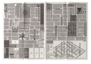 If these characters were laid out with no apparent connection, you might only see random patterns. But I was surprised to discover that once these characters were brought together within a shape that we were familiar with (a newspaper in this case), people began to recognize them as text. They discovered words that they were able to make out and were actually able to read the text. This work lies on the boundary between what people see as patterns and what people see as functional letters. So this is a font and it is also handwriting in the realm of digital text entry.